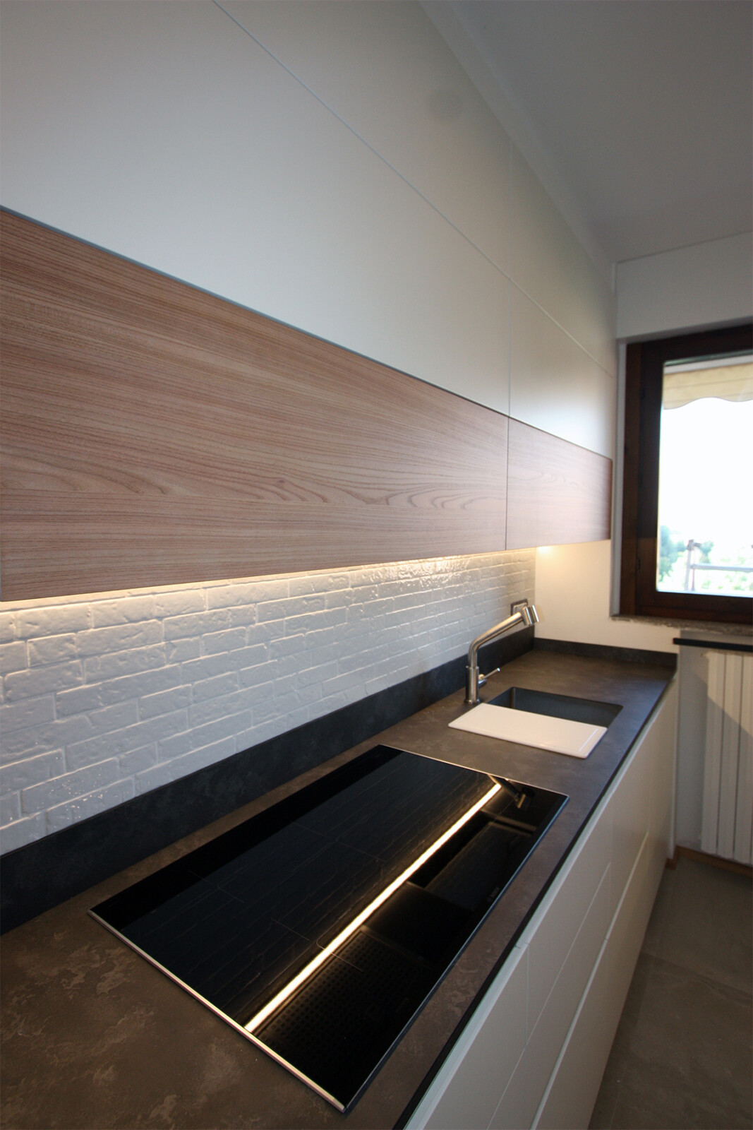 Per le superfici orizzontali si è scelto l’utilizzo del paruqet rovere e del gres effetto pietra, l’affiancarsi di materiali caldi e freddi lo si ritrova nella zona cucina e nel bagno.
